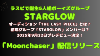 興味STARGLOW(スターグロウ)メンバー・プレデビュー日&曲は? THE LAST PIECE(ザ ラスト ピース・ラスピ)で誕生した5人組ダンス&ボーカルグループSTARGLOW(スターグロウ)。メンバーの生年月日やMBTIなどプロフィール・プレデビュー日&曲について。9月22日「Moonchaser」 2025.09.20興味