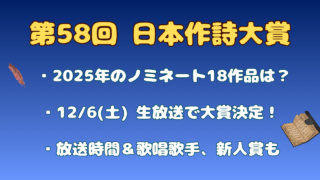 記録第58回 日本作詩大賞 2025年のノミネート作品と生放送日時は 第58回 日本作詩大賞ノミネート作品が発表された。2025年の18作品について、タイトルと作詩家・歌唱歌手の他、作曲家とレコード会社も合わせてまとめた。12月6日BSテレ東の生放送内で大賞が決まる。番組内では最優秀新人賞の作品も歌唱される。 2025.10.27記録