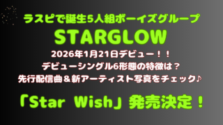 興味STARGLOW(スターグロウ)デビュー日は?シングル発売決定! BMSG「THE LAST PIECE」(ザ ラスト ピース・ラスピ)オーディションで誕生した「STARGLOW」(スターグロウ)のデビュー日とデビュー曲が決定!ファーストシングル発売日、収録内容や形態違いの付属や特典、新アーティスト写真。 2025.11.10興味