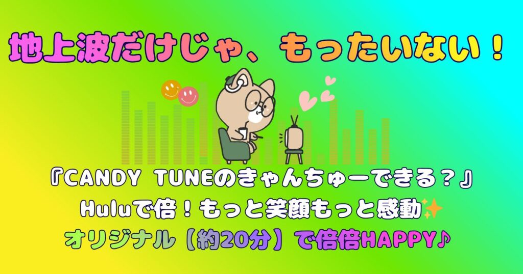興味「きゃんちゅーできる?」見逃しはTVerよりHulu?未公開映像20分追加! 「CANDY TUNEのきゃんちゅーできる?」きゃんちゅー冠番組の見逃し配信はTVerだけじゃ半分もったいない!Hulu版は地上波未公開映像が「約20分」も追加。#1の19分48秒など、秒単位でガチ検証した「配信時間」!推しの素顔を倍楽しむならHulu一択! 2026.01.13興味