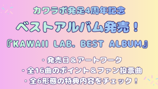 興味カワラボベスト全6形態特典比較!&収録曲レビュー【KAWAII LAB.】 カワラボ初のベストアルバム「KAWAII LAB. BEST ALBUM」どれを買う?6形態の特典・封入トレカを徹底比較!収録全曲レビュー&ファン投票曲の深掘り解説や試聴ボタンも完備。自分にぴったりの1枚がすぐに見つかる、迷えるファン必見のガイドです♪ 2026.01.24興味