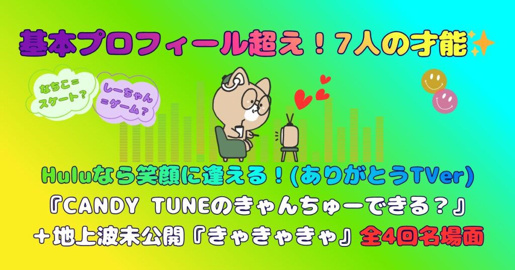 記録なちこ&しーちゃん おにぎり他『きゃんでき』見どころ CANDY TUNE(きゃんちゅー)をHuluで! TVer配信終了!CANDY TUNE(キャンディーチューン)冠番組『きゃんちゅーできる?』をHuluで楽しもう!こっちゃんバイト・りのまる英語・なったん卓球・きりちゃんバスケ・びびちゃん食リポ…全4回を解説!地上波未公開映像各回約20分『きゃきゃきゃ』も必見。 2026.02.01記録