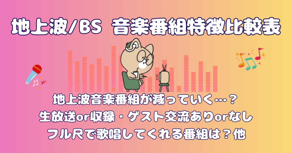 記録with MUSIC終了で後番組は?2026最新地上波・BS音楽番組を比較! 「with MUSIC」終了のニュースに驚いた方も多いはず。2026年最新の地上波音楽番組8選、BS名番組5選、特徴比較表!フルコーラスで歌の物語を堪能できる「人生、歌がある」。話題曲も名曲カバーも、若手からベテランまで今の音楽を楽しむための完全ガイド! 2026.03.04記録