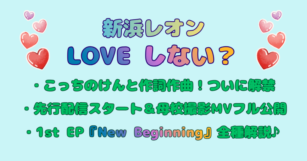 興味新浜レオン 紅白同期こっちのけんと作詞作曲!楽曲提供の全貌を解禁 同い年・紅白同期の絆!新浜レオン×こっちのけんと作詞作曲「LOVE しない?」楽曲提供の全貌!母校でのMV撮影秘話や1st EP全形態のジャケ写、レオン語満載の盤名や収録曲をご紹介。発売当日、4月15日のラゾーナ川崎イベント情報もチェック! 2026.04.01興味